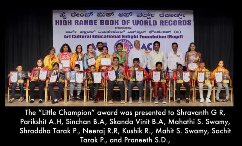 The “Little Champion” award was presented to Shravanth G R, Parikshit A.H, Sinchan B.A, Skanda Vinit B.A, Mahathi S. Swamy, Shraddha Tarak P., Neeraj R.R, Kushik R., Mahit S. Swamy, Sachit Tarak P., and Praneeth S.D., who participated in world record attempts and showcased exceptional skills and commitment to their crafts. The ceremony featured distinguished guests such as senior journalist Siddharaju, celebrated historian Dr. Talakadu Chikka Rangegouda, and KT Chandru, directory editor of Vishwa Vokkaliga Sangha. Teachers instrumental to the children’s success—including Kishore Kumar, Roopshree NR, Lakshmi Sri Sudhakar, Neeta S. Shetty, Vidushi Shubha Hegde, and Sharan Roj—were also recognized.