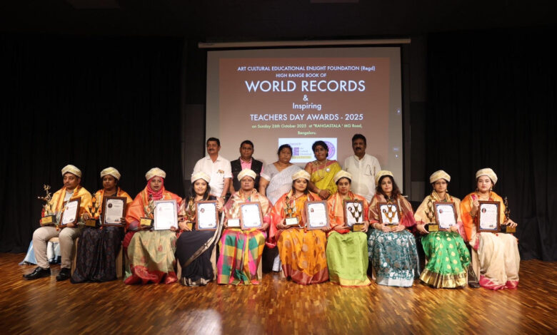 The At Cultural Educational Enlight Foundation founder Ambika .C hosted a remarkable Teachers’ Day Award Ceremony at the Rangasthala auditorium in Bengaluru Metro Station on Sunday, recognizing outstanding contributions by educators from different fields.